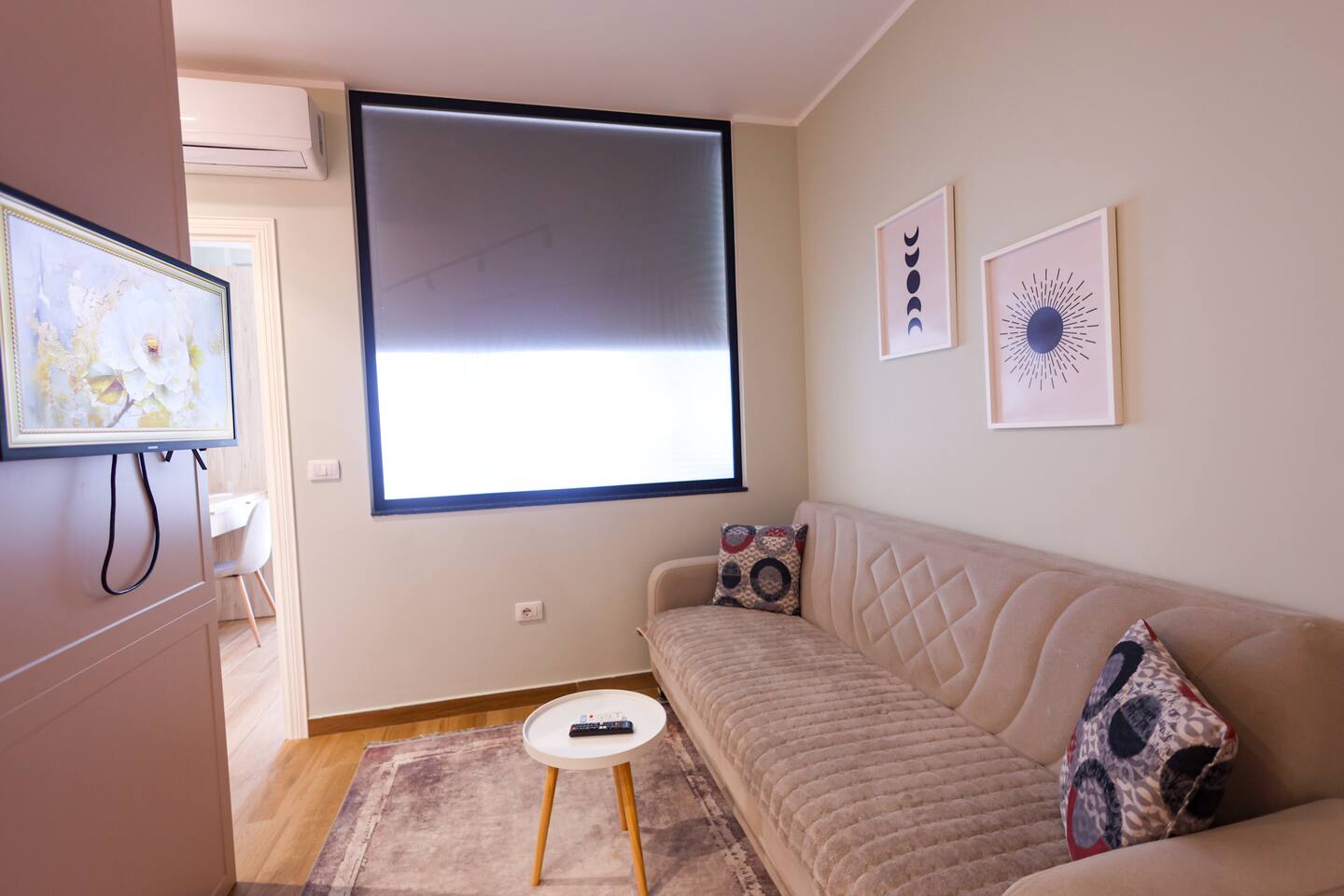 Stylish and compact 1+1 apartment in the center of Durres, perfect for urban stays. Features a bright bedroom with large windows, a cozy living room with sofa bed, a smartly designed kitchen, and a modern bathroom. Soft colors, functional layout, and quality finishes, offering comfort and convenienc...